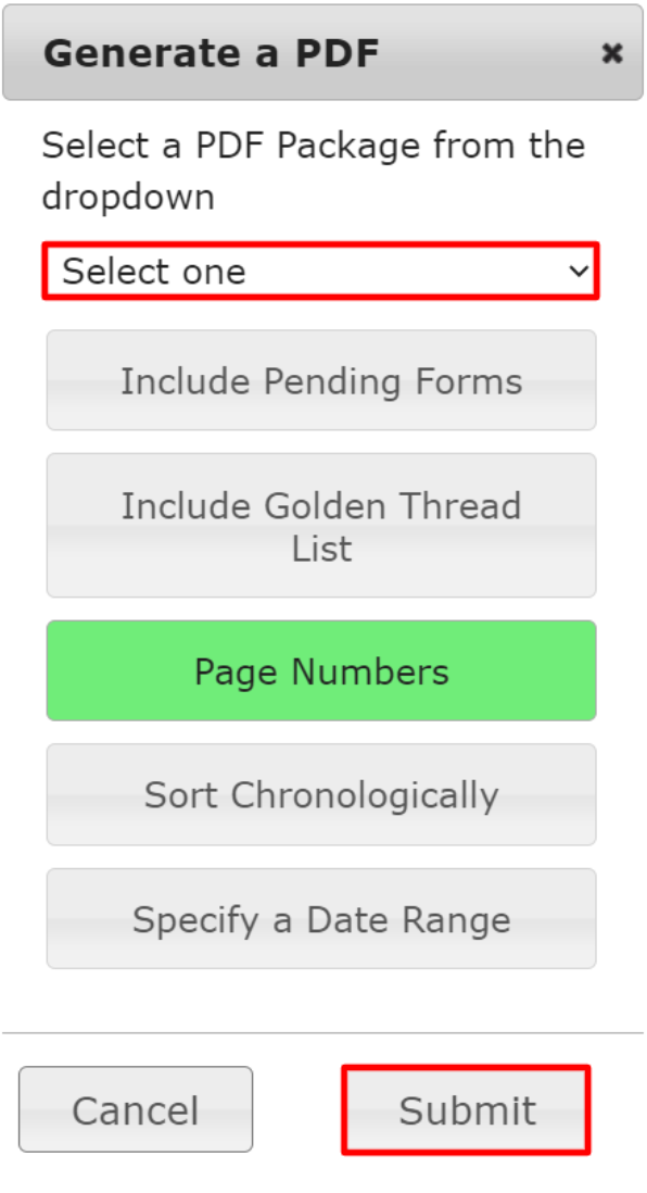 - From the Generate a PDF pop-up, select the correct package from the drop-down options and click the Submit button.