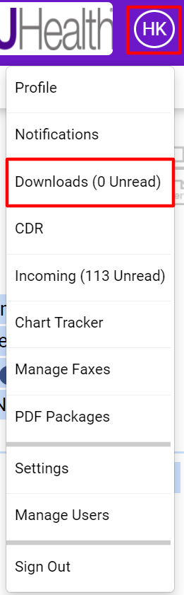 - To locate the PDF select your Initials in the top right corner and go to Downloads.