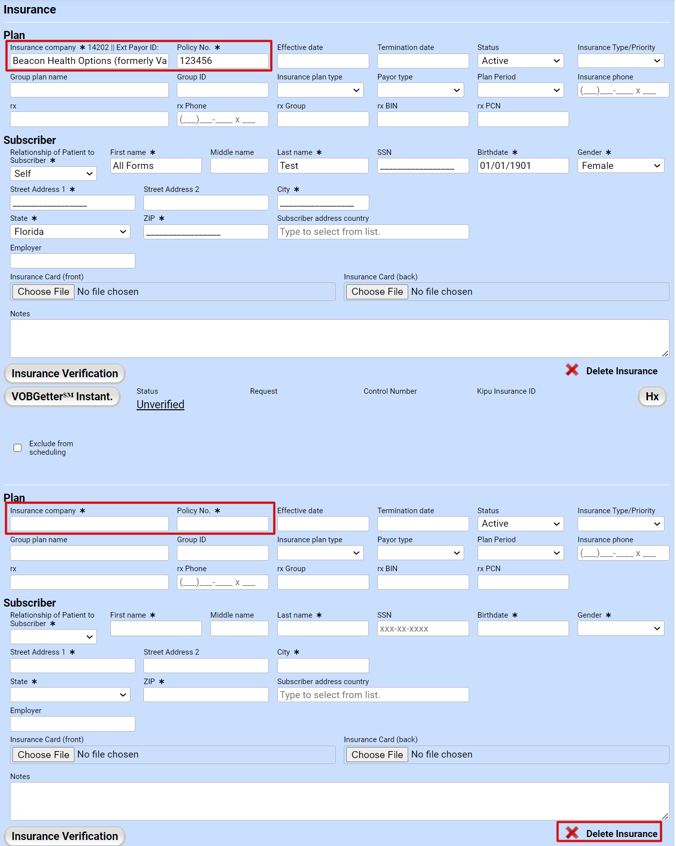 - Scroll down to the Insurance section and either Delete the second blank insurance plan section or Complete the information if applicable.