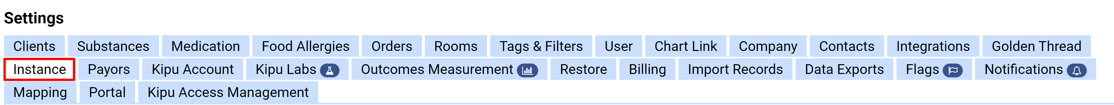 Kipu EMR, Roles: Super Admin, Settings: Instance, Forms: Evaluations
