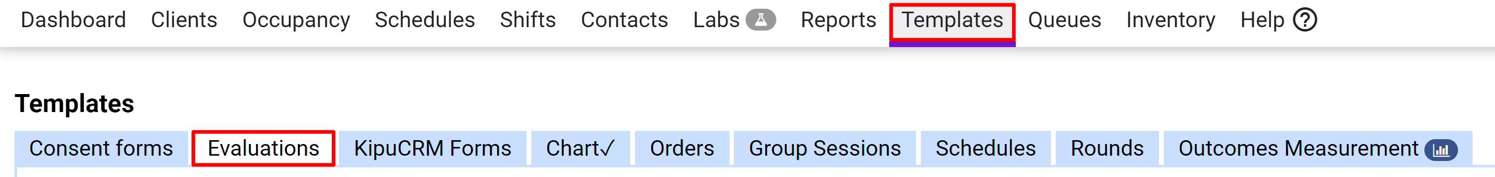 - Select the Templates tab in the top toolbar, then the Evaluations tab.