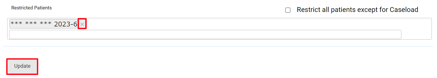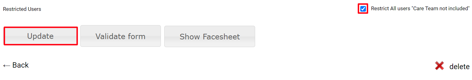 - Scroll all the way to the bottom of the facesheet, unclick the Restrict All users "Care Team not included" box (make sure the box unchecked), and select the Update button.