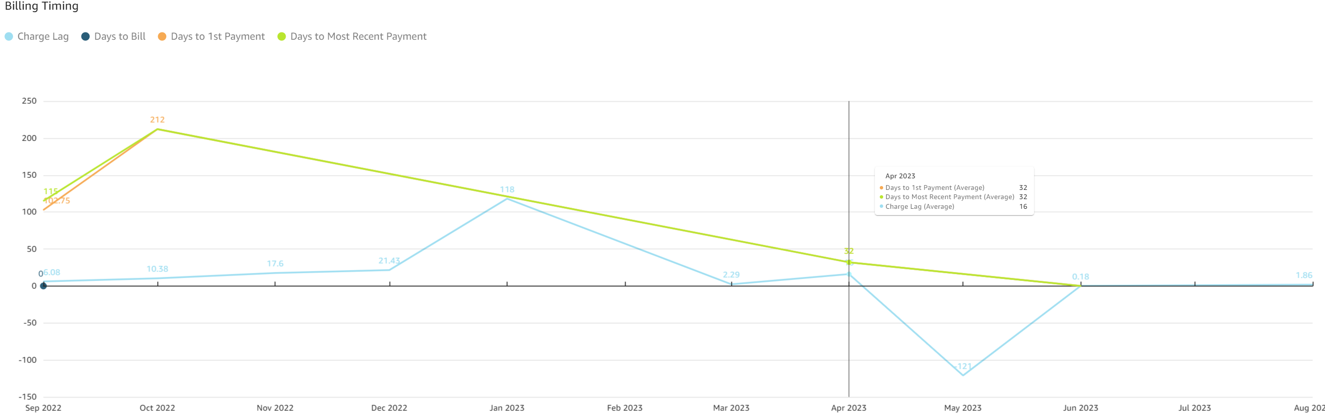 - Billing Timing: The line graph displays billing key performance indicators. The number of days displayed on the y axis while the Month_YYYY is displayed on the x axis. Lines for charge lag, days to bill, days to 1st payment, and days to most recent payment are color coded.