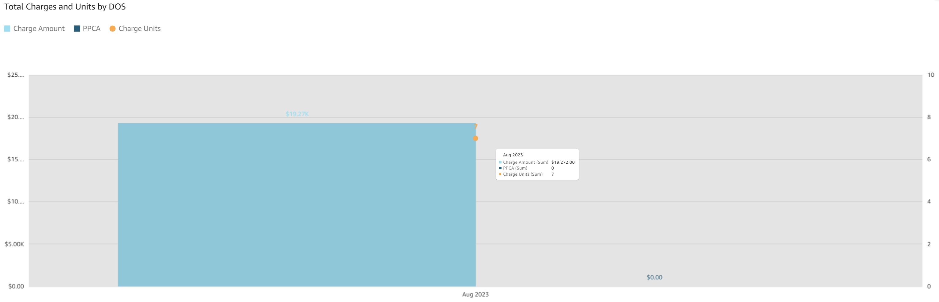 - Total Charges and Units by DOS: The bar/line graph displays charge unit totals, charge and primary payer contracted amounts month over month. The total dollar amounts are on the y axis on the left, counts on the right y axis, the lines display charge unit totals, and the bars are color coded.