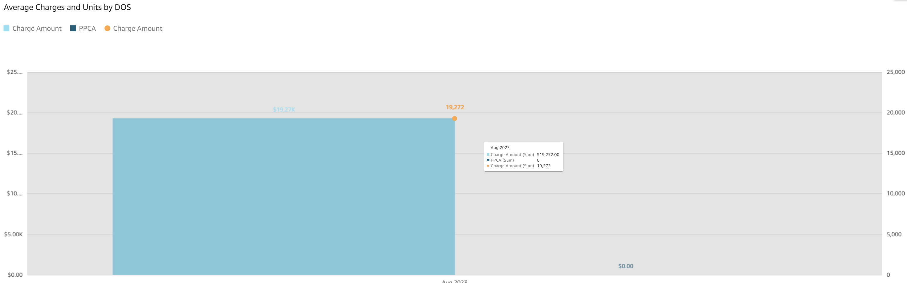 - Average Charges and Units by DOS: This bar/line graph displays average charge unit totals, average charge amounts, and average primary payer contracted amounts month over month. The average dollar amounts are displayed on the left y axis, average counts on the right y axis, lines display average charge units, and the bars are color coded.