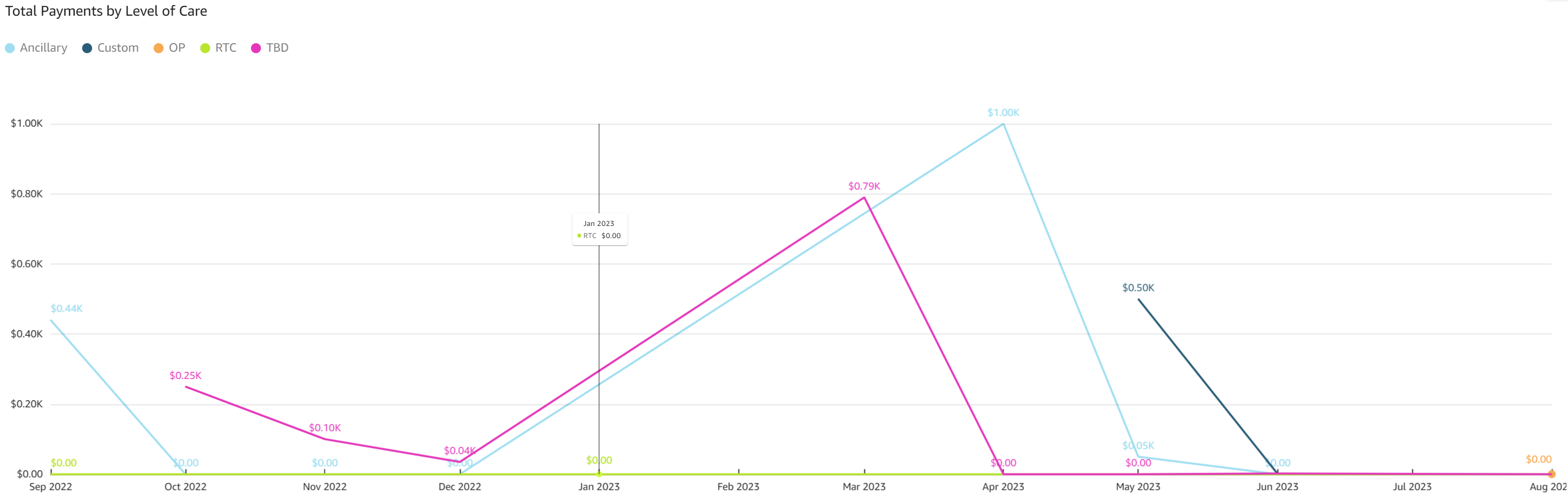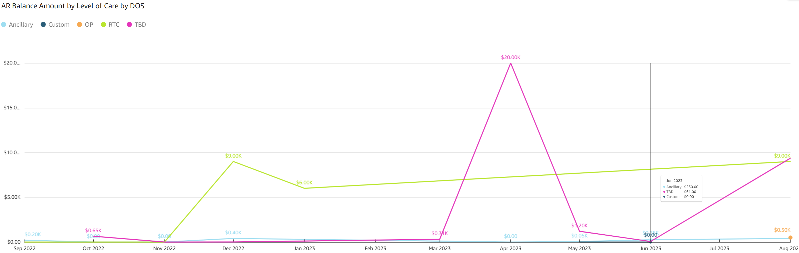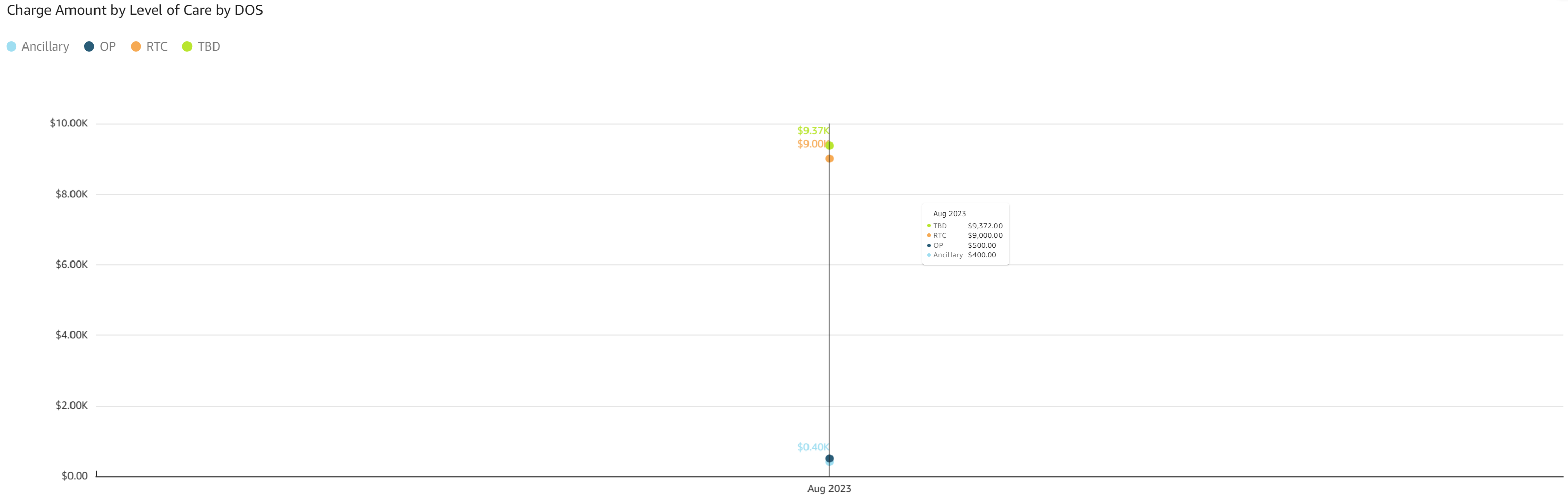 - Charge Amount by Level of Care by Date of Service (DOS): The line graph displays charge amounts by level of care and date of service. Dollar amounts are displayed on the y axis for charge amounts and lines are color coded by level of care.