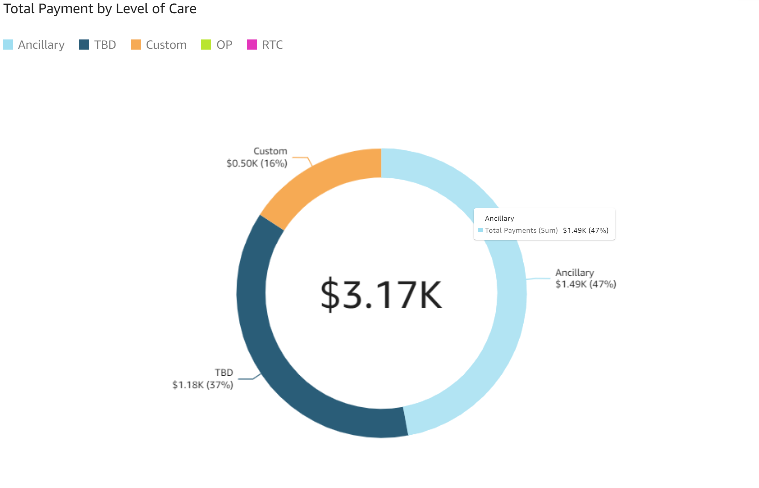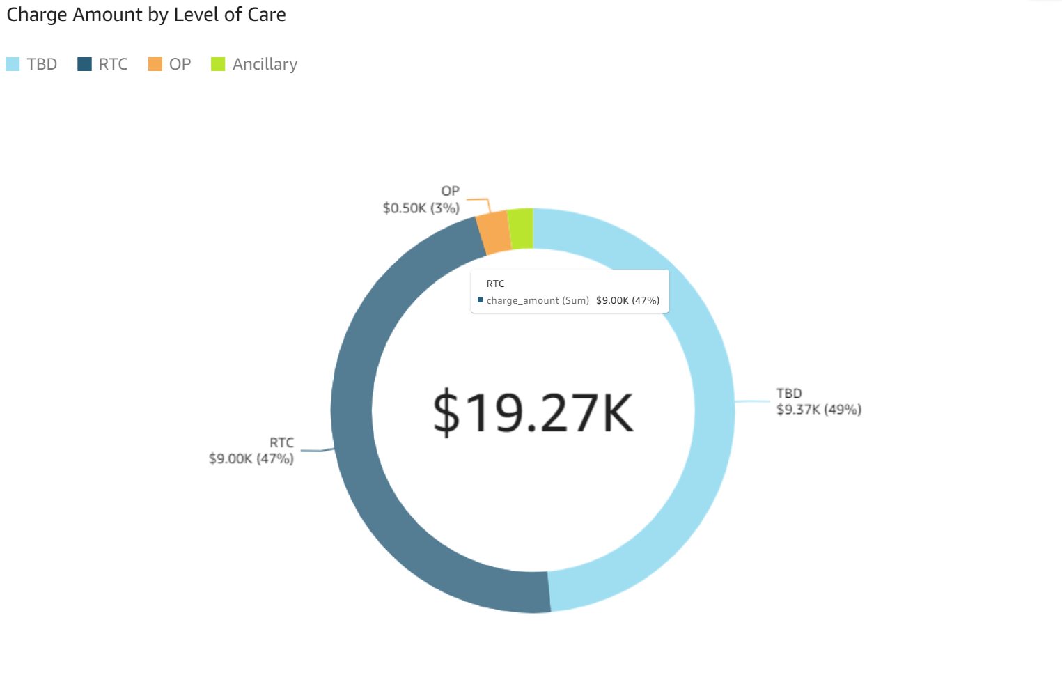 - Charge Amount by Level of Care: The donut chart displays charge amounts color coded by level of care. The overall total charge amount is displayed in the center.