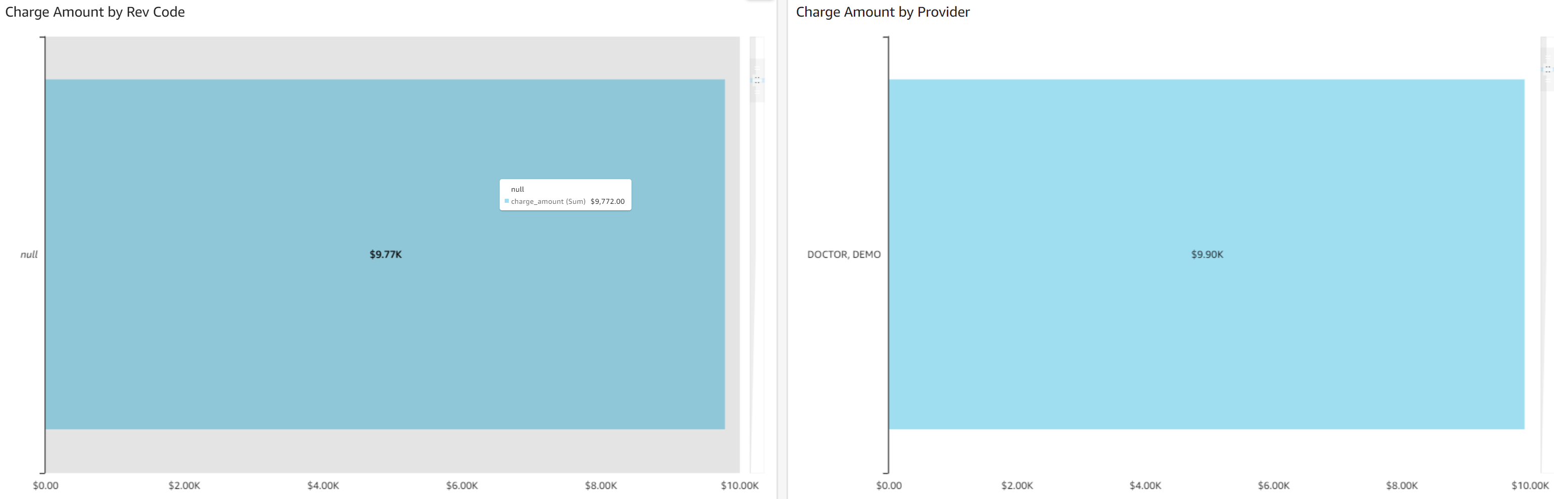 - Charge Amount by Rev Code: This horizontal bar graph displays charge amounts by revenue code