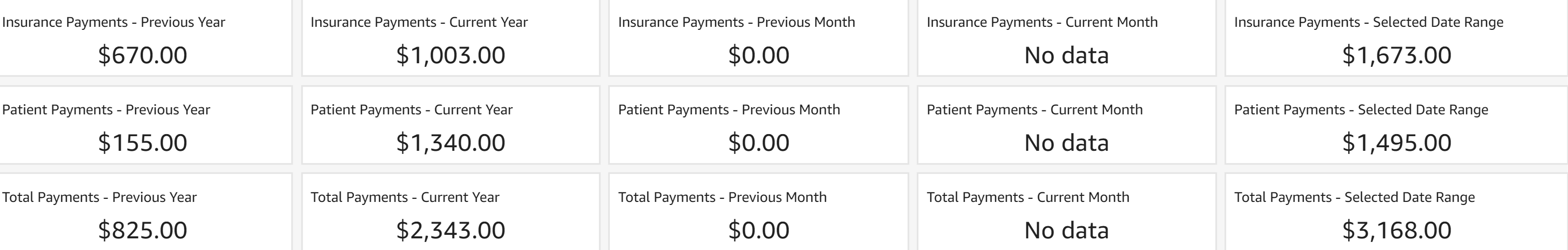 - Insurance Payments - Selected Date Range: Indicates the total insurance payment amount in the selected date range based on date of service