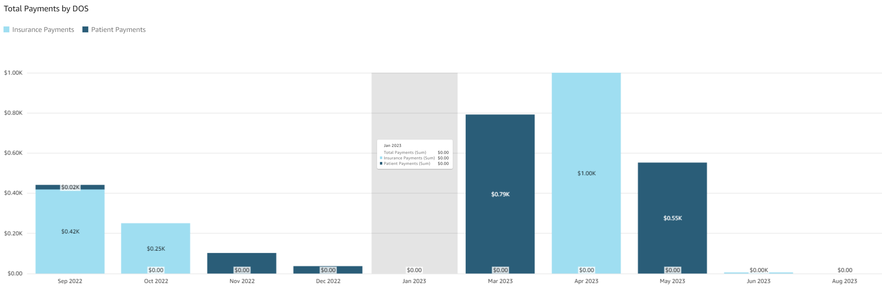 - Total Payments by Date of Service (DOS): The stacked bar graph shows total payments by date of service. The month and year of the date of service is listed on the x axis, the payment amount in dollars is displayed on the y axis, and payment responsibility is color coded.