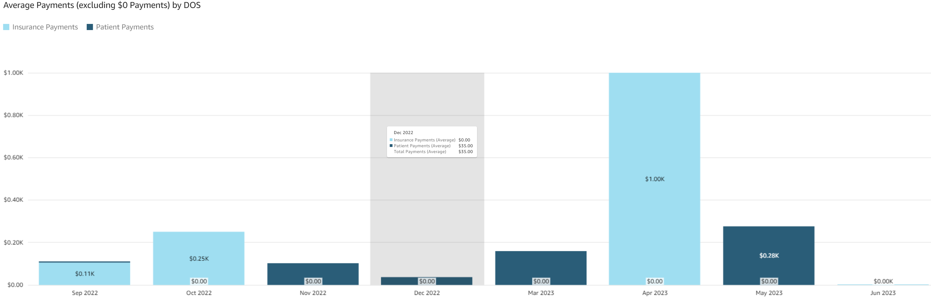 - Average Payments by Date of Service (DOS): The stacked bar graph displays average payments by date of service with the month and year of the DOS on the bottom and the average payment amounts on the left. The bars are color coded by payment responsibility. Payments of $0 are included in the calculations.