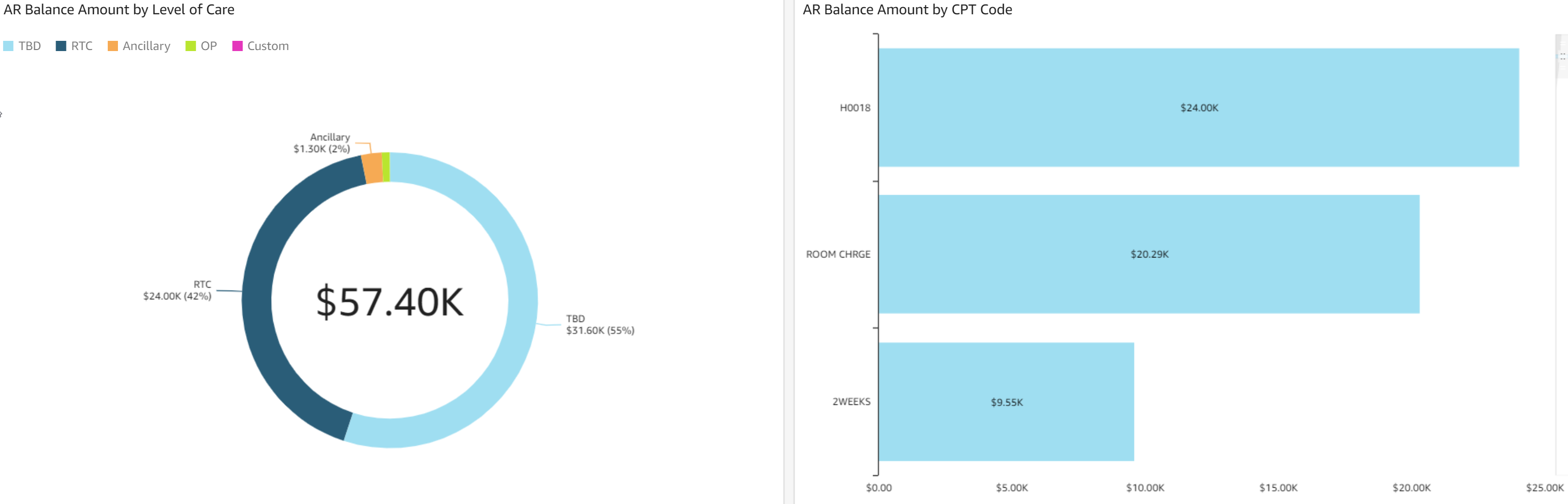 - AR Balance Amount by Rev Code: The bar graph for AR amounts by revenue code shows accounts receivable dollar amounts on the bottom and rev codes on the left.
