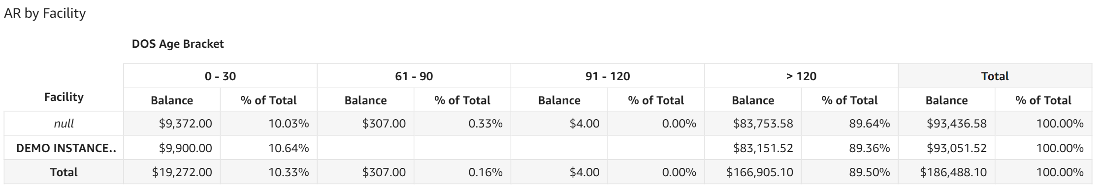- AR by Facility: This table displays AR dollar amounts and the percentage of total AR for each date of service aging category broken out for each facility.