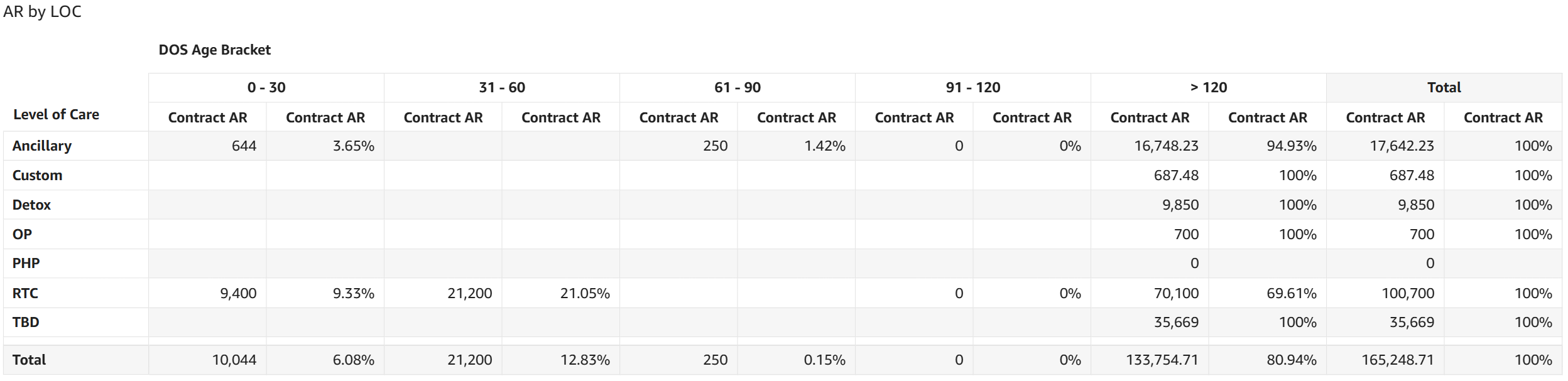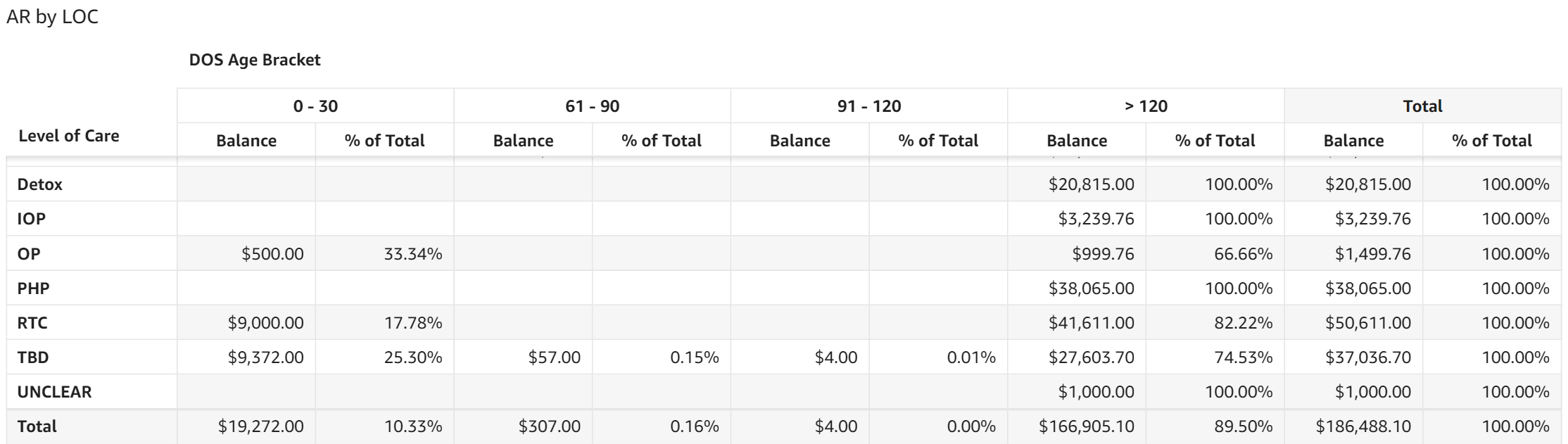 - AR by Level of Care (LOC): The table displays AR dollar amounts and the percentage of total AR for each date of service aging category broken out for each level of care.