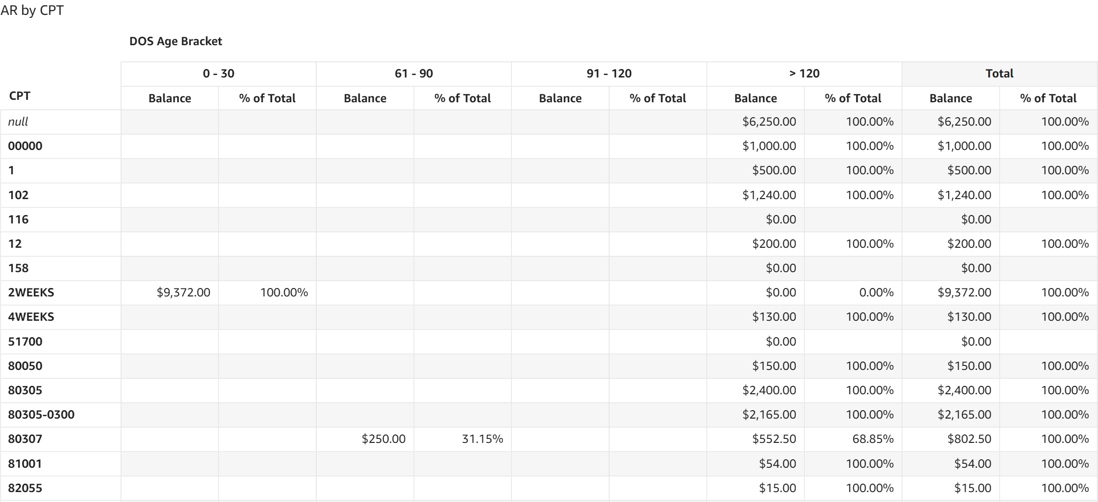 - AR by CPT: The table displays AR dollar amounts and the percentage of total AR for each date of service aging category broken out for each CPT code.