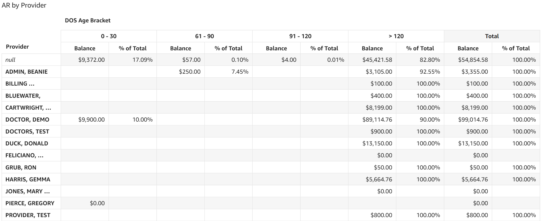 - AR by Provider: This table displays AR dollar amounts and the percentage of total AR for each date of service aging category broken out for each provider.