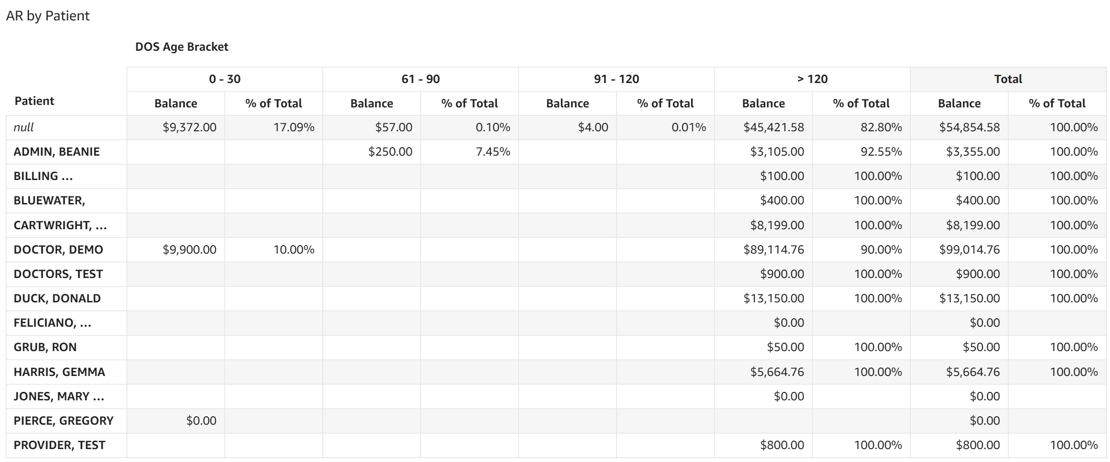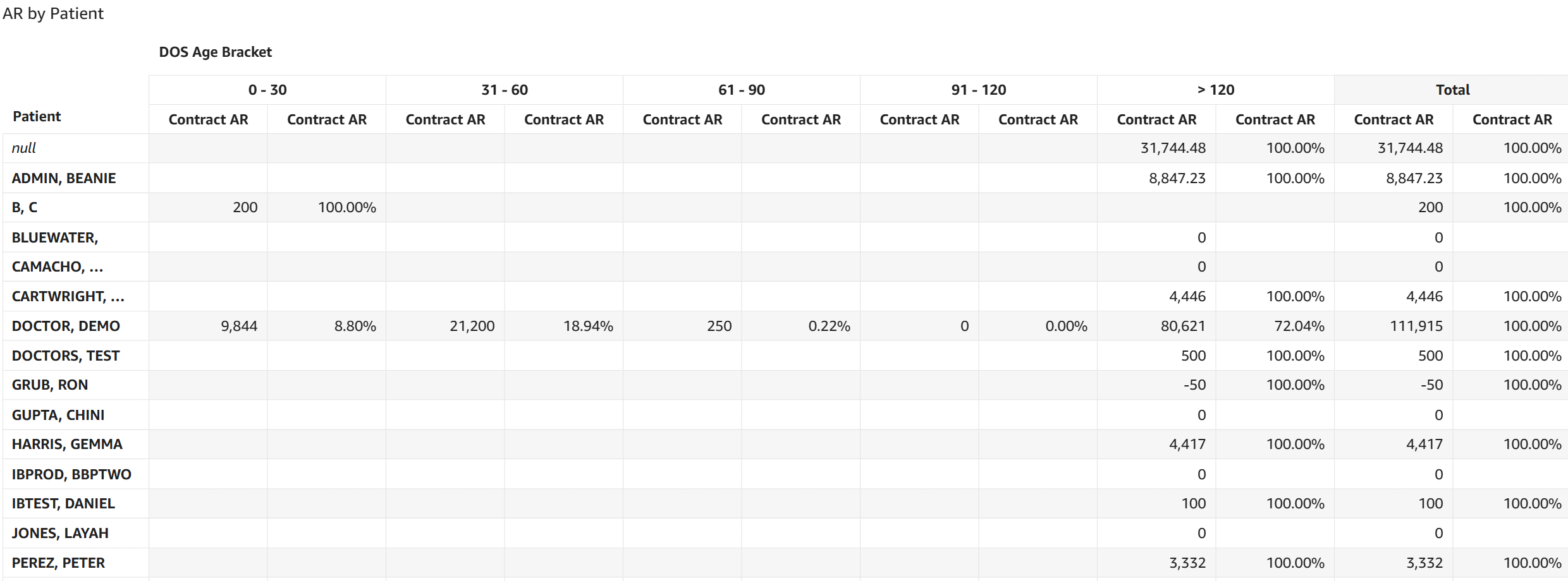 - AR by Patient: This table displays AR dollar amounts and the percentage of total AR for each date of service aging category broken out by patient based on the contracted rates entered in CMD.