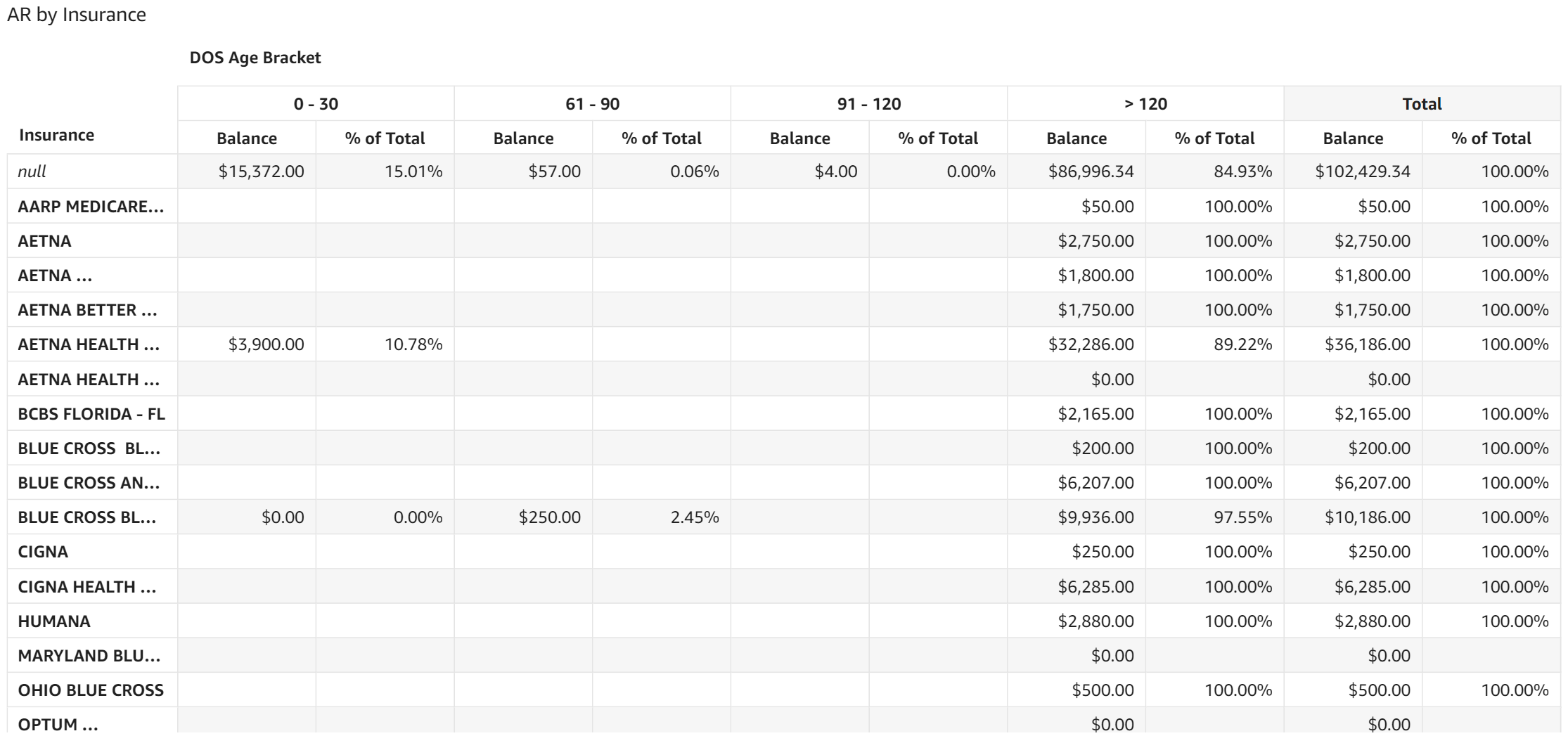 - AR by Insurance: The table displays AR dollar amounts and the percentage of total AR for each date of service aging category broken out by insurance.