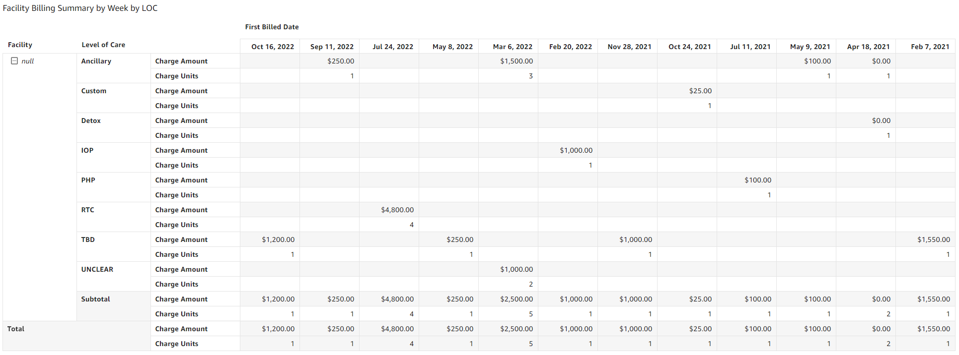 The Billing Summary – LOC tab can be used to review the summarized billing data broken out by level of care for each week, month, and year. It can be leveraged for quick reference on charge amount and units.
