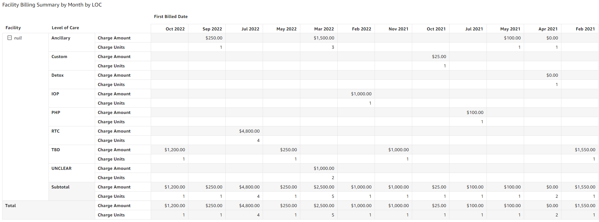 - Facility Billing Summary by Month by Level of Care (LOC): Table displays the following fields: