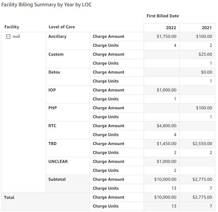 - Facility Billing Summary by Year by Level of Care (LOC): The table displays the following fields: