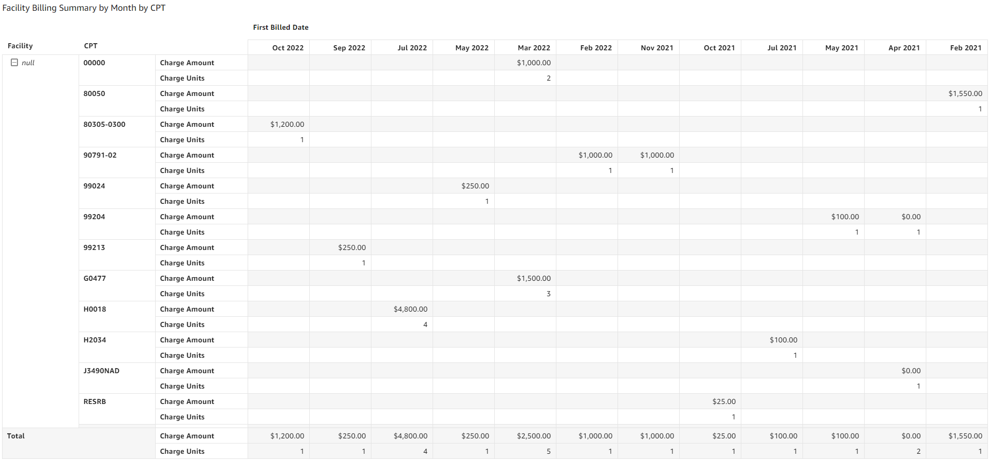 - Facility Billing Summary by Month by CPT: The table displays the following fields:
