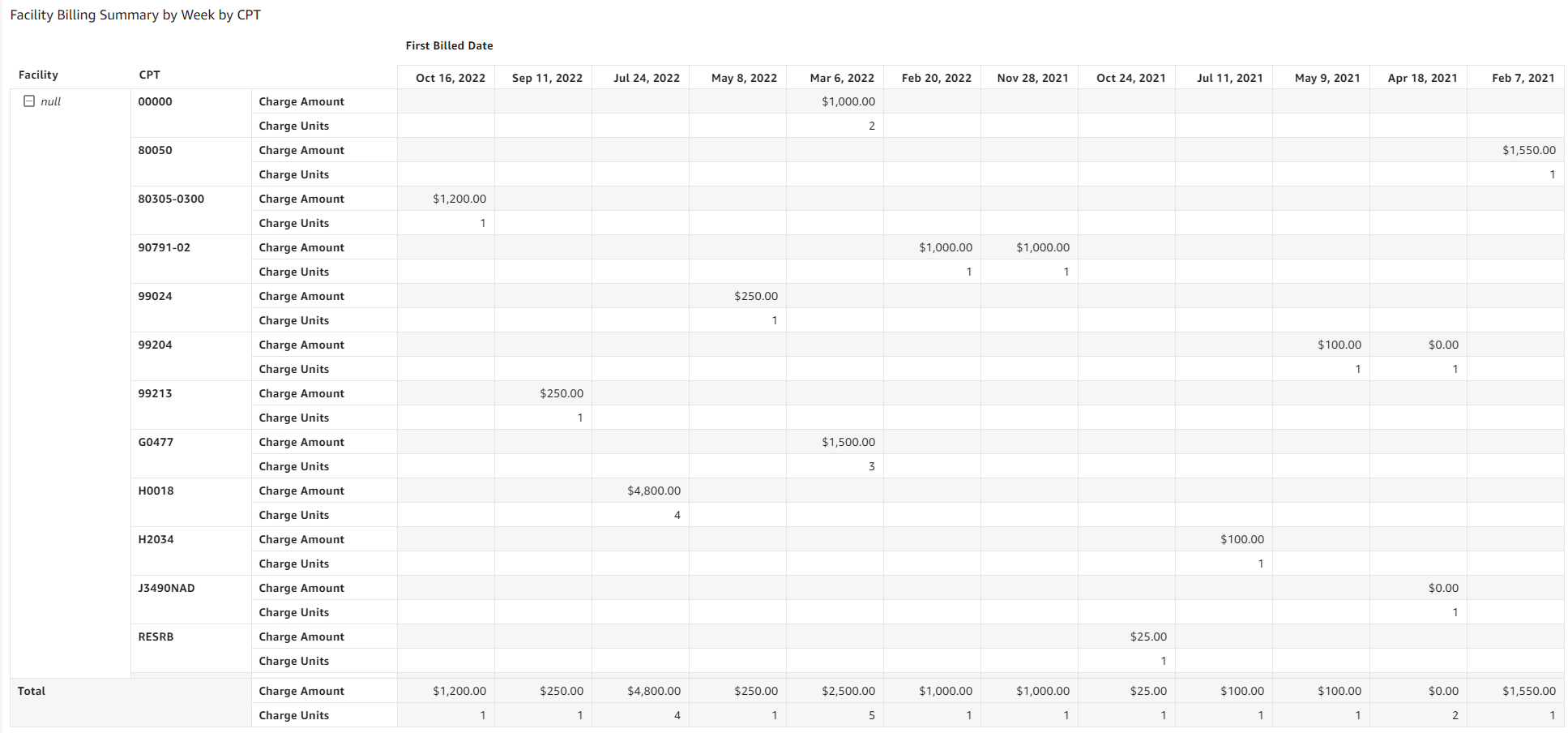 - Facility Billing Summary by Week by CPT: Table displays the following fields: