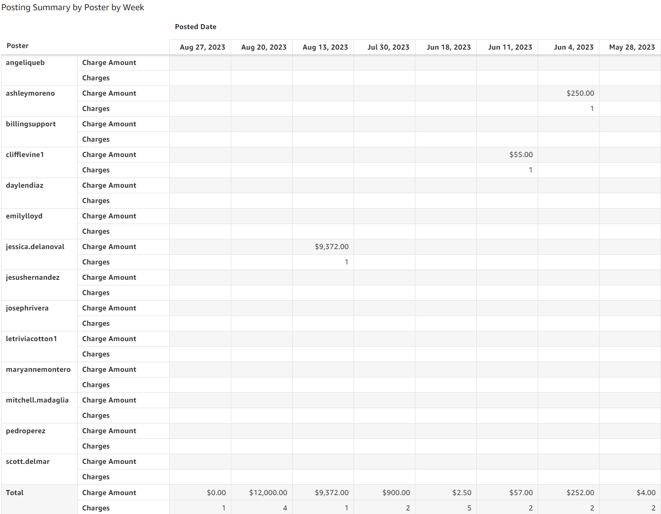 - Charge Posting Summary by Poster by Week: Table displays the following fields: