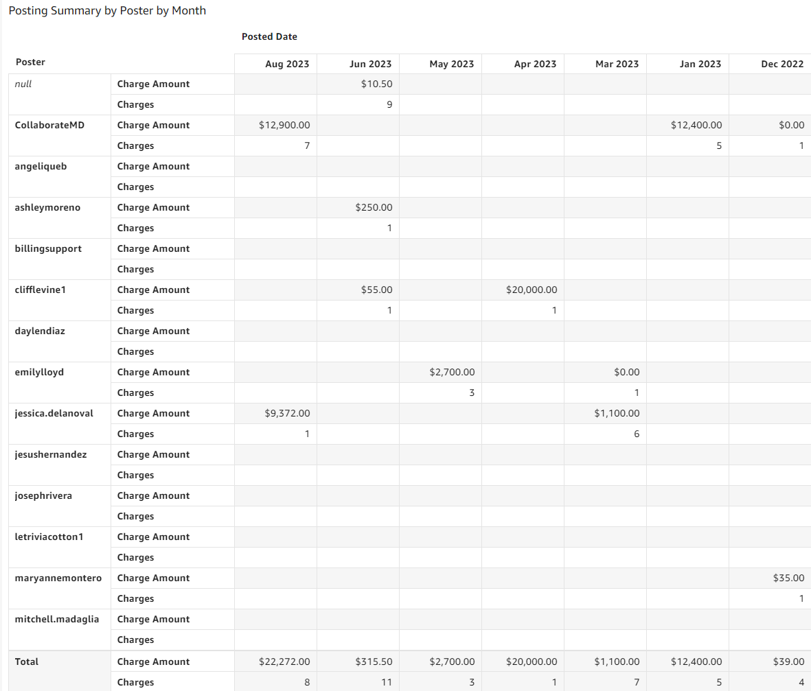- Charge Posting Summary by Poster by Month: Table displays the following fields: