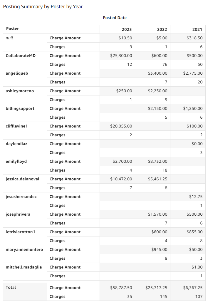 - Charge Posting Summary by Poster by Year: The table displays the following fields: