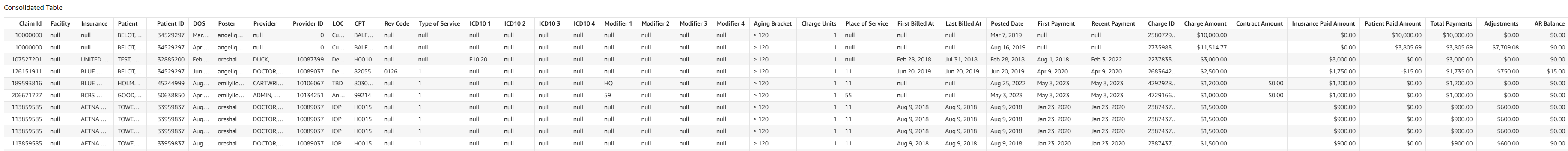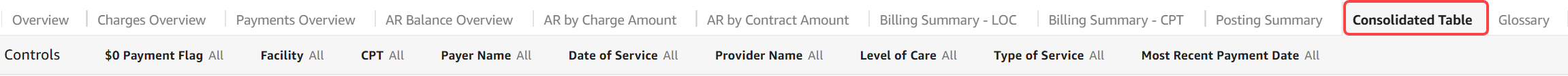 The Consolidated Table tab provides the full data table used in the Revenue Cycle dashboard. It can be exported to a CSV file and used for further manipulation. It can also be used to provide line item detail.