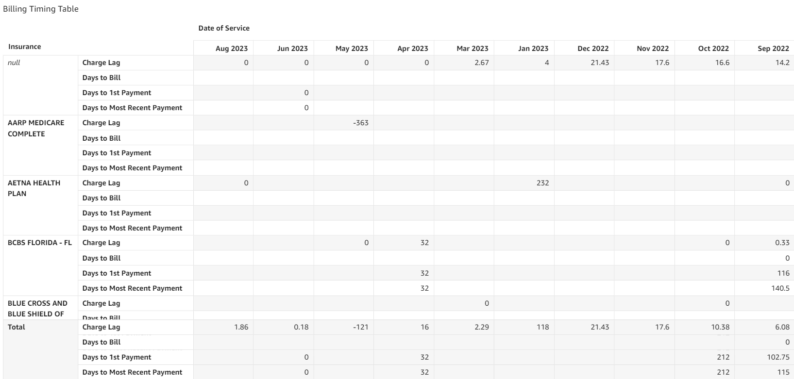 - Charge Lag: Difference in days between service date and charge posted date