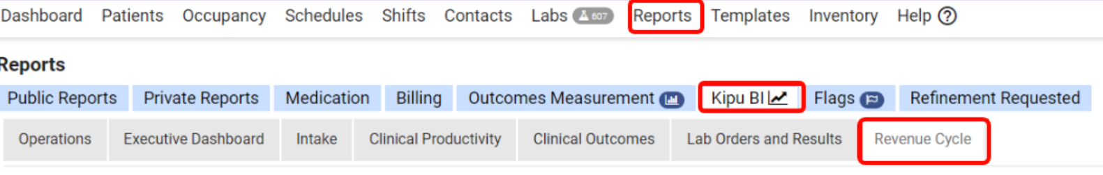 To navigate to the tab, click on Reports > Kipu BI > Revenue Cycle.
