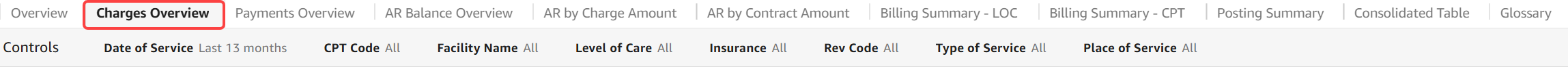 The Charges Overview tab can be used to compare primary payer contracted amounts against the charge amounts and units. It can also provide year-to-year and month-to-month benchmarking.