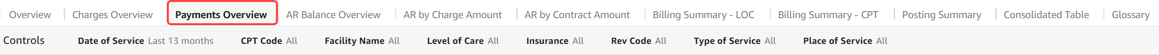 - Total Payments - Selected Date Range: Indicates the total payment amount in the selected date range based on date of service