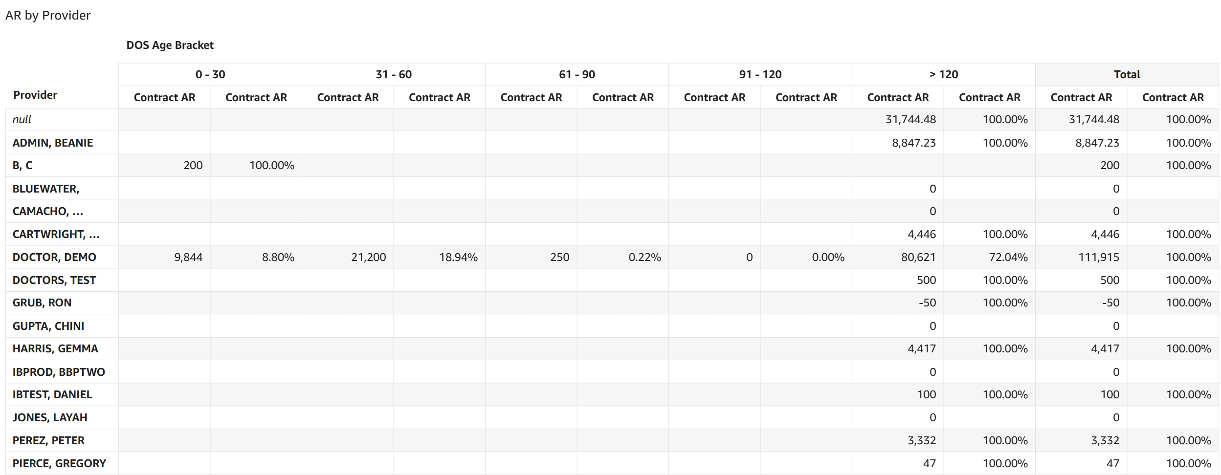 - AR by Provider: This table displays AR dollar amounts and the percentage of total AR for each date of service aging category broken out for each provider based on the contracted rates entered in CMD.