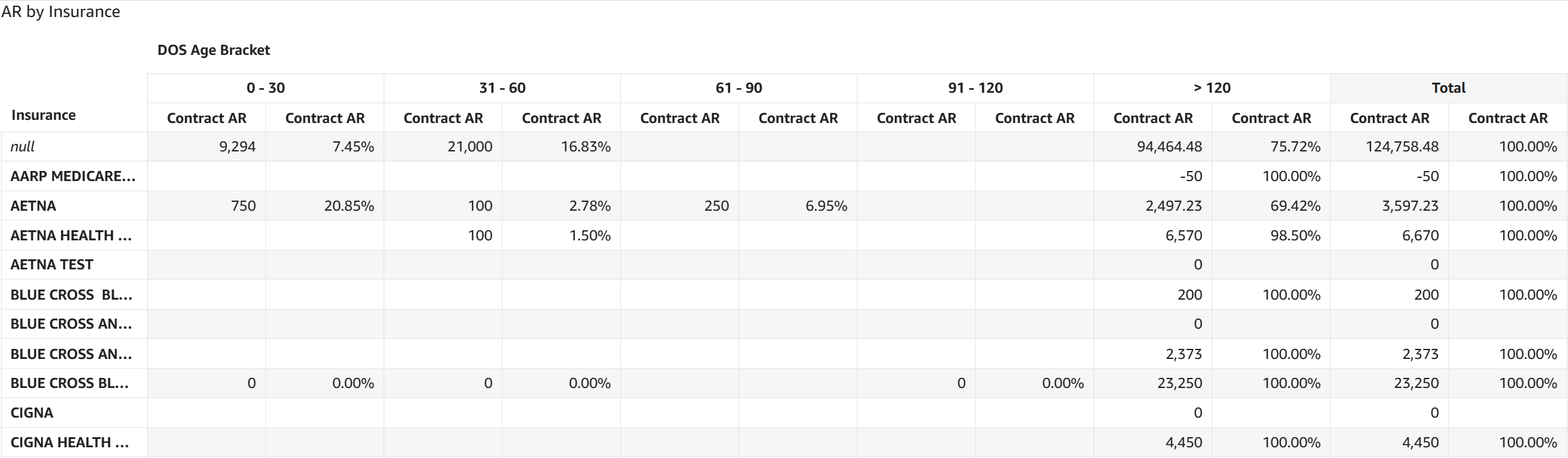 - AR by Insurance: The table displays AR dollar amounts and the percentage of total AR for each date of service aging category broken out by insurance based on the contracted rates entered in CMD.