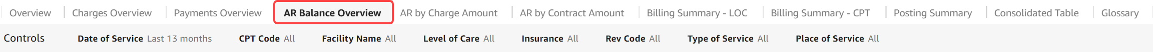 The AR by Charge Amount tab can be used to review accounts receivable balances over time and by source. You can see which insurance companies, levels of care, CPT codes, and revenue codes make up the accounts receivables.