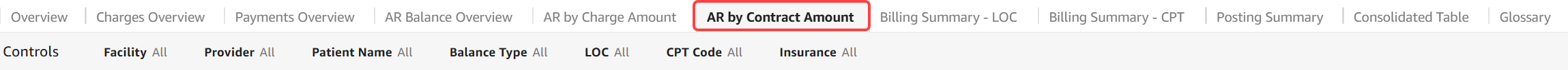 The AR by Contract tab can be used to review accounts receivable balances based on contracted rates entered in CollaborateMD (CMD) over time and by source. You can see which insurance companies, levels of care, CPT codes, and revenue codes make up the accounts receivables.