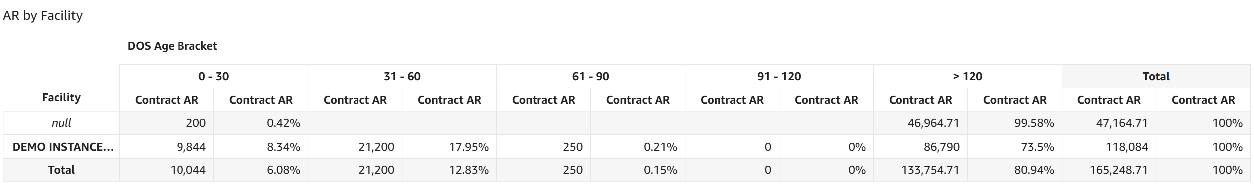 - AR by Facility: This table displays AR dollar amounts and the percentage of total AR for each date of service aging category broken out for each facility based on the contracted rates entered in CMD.