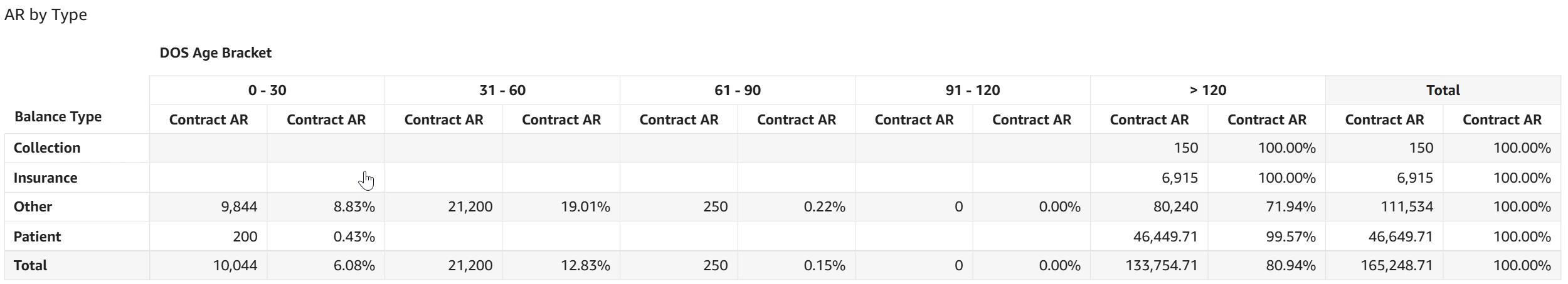 - AR by Type: This table displays AR dollar amounts and the percentage of total AR for each date of service aging category broken out for each AR balance type based on the contracted rates entered in CMD.