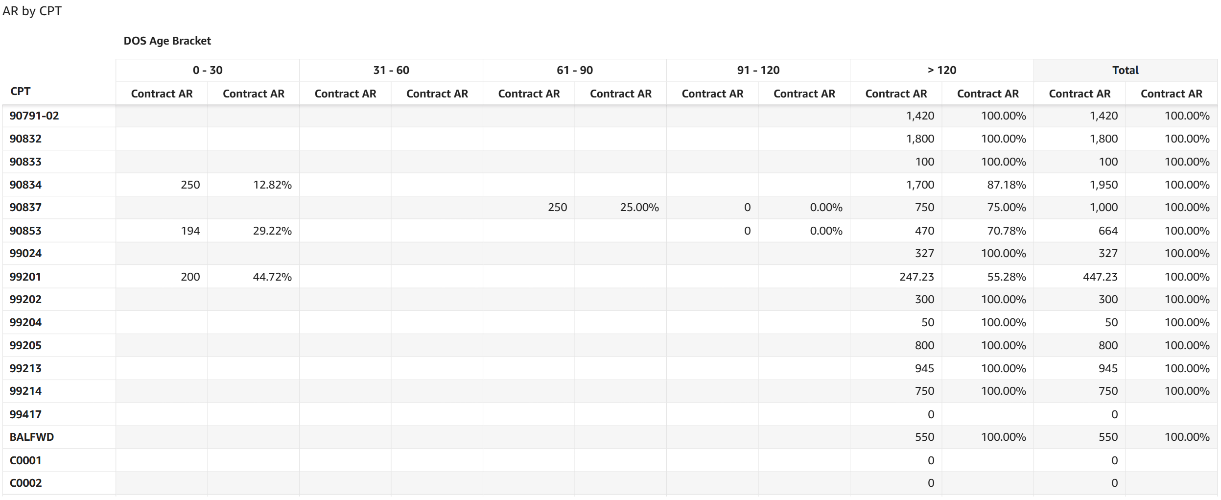 - AR by CPT: The table displays AR dollar amounts and the percentage of total AR for each date of service aging category broken out for each CPT code based on the contracted rates entered in CMD.