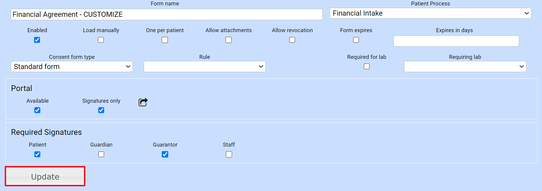 - Save the form by clicking the Update button.