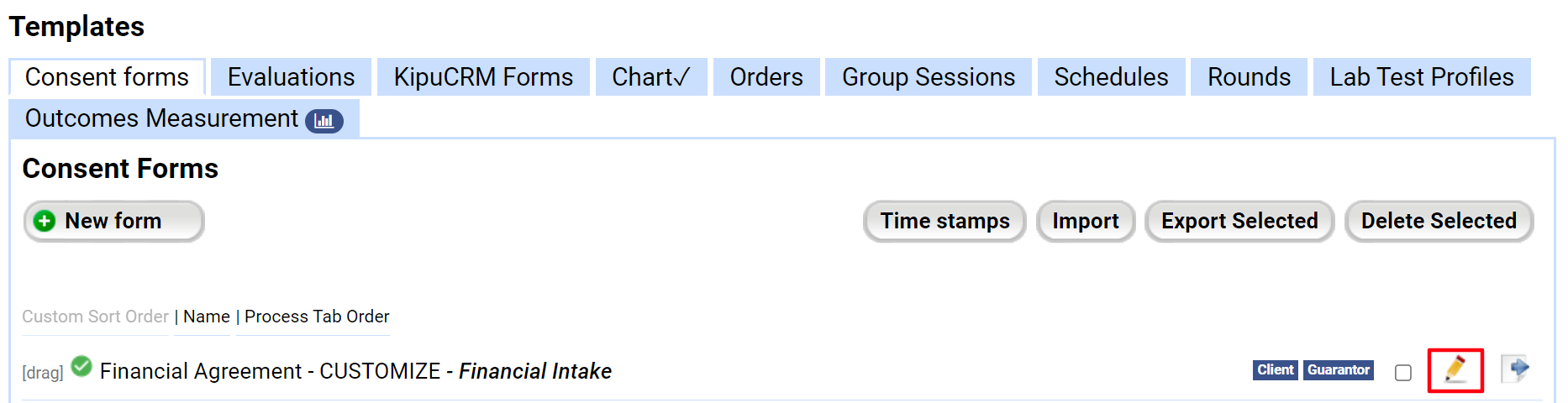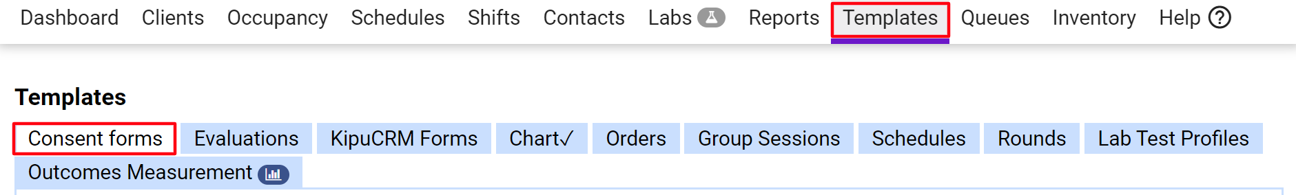 - Select the Templates tab, and go to either the Consents or Evaluations tab depending on the form.