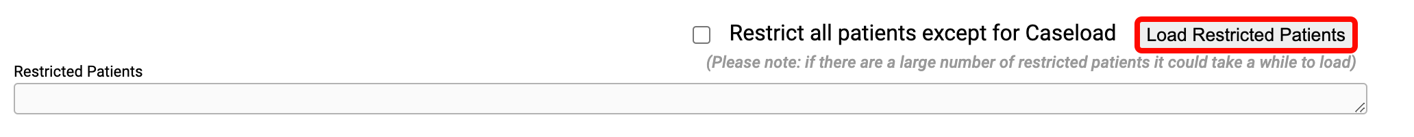 - Manage Users: Fixed an issue where some users with the Restrict All Patients Except for Caseload permission would time out and get a 504 server error. Now, a Load Restricted Patients button will appear when the user profile has at least one restricted patient. Click this button to display the restricted patient list.