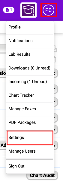 - To modify the MR format in your charts, select your initials in the top right corner and then Settings.