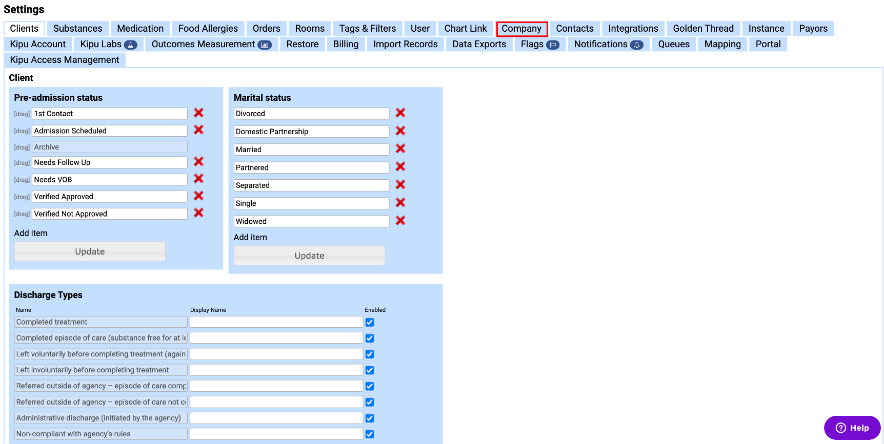KIPU EMR, Role: Super Admin, Settings: Company Tab (Locations)