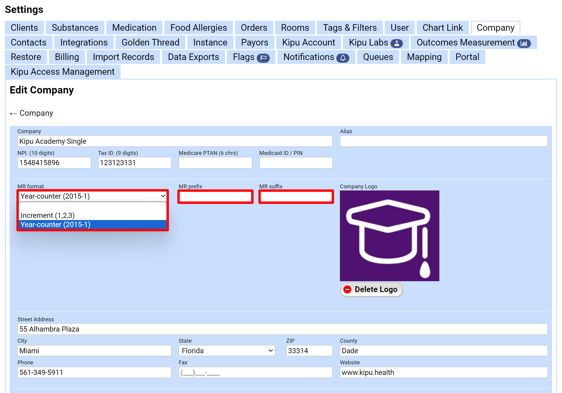 - In the new window select the drop-down for the MR Format, choose to track either by Year-counter or by Increment, then add any MR Prefix or MR Suffix if applicable.