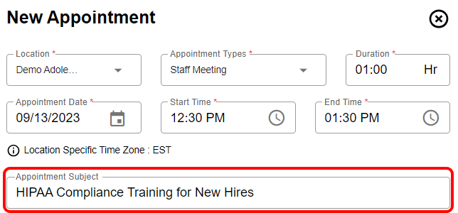 - Use the Appointment Subject field to individualize the appointment type. This name will appear in the calendar.