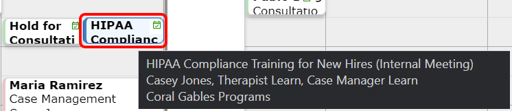 - In the Calendar and List View, non-patient appointments display the name of the appointment or appointment type rather than the name of a patient first. The appointment type will still appear, and if you hover over the appointment, you will see the full appointment subject.